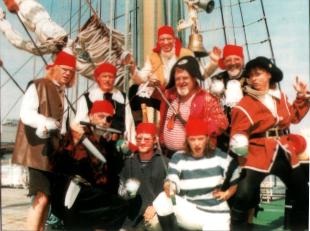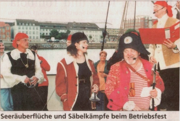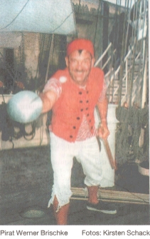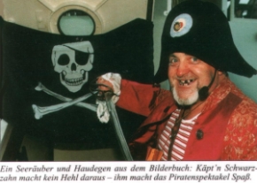 Piratenprüfung verteilen und ruft seine wüsten Seeräuber zum Rückzug. Die Gäste sind begeistert, vom Schrecken oder den Vorbehalten vor den Piratensongs ist nichts mehr zu spüren. "Wenn sie vom Fluchen kommen, sind sie immer ganz locker", weiß Helene Daiminger aus Erfahrung. Das erste Piratenspektakel organisierte sie 1995 zur "Sail" in Bremerhaven. Damals waren es Kinder, die an Bord der Hanse-Kogge das Piratenleben kennenlernten. Im Herbst 1998 trat das Best Western Hotel Naber mit dem Wunsch an die Gruppe heran, eine Piratenparty auszurichten. Kurzerhand wurde das Kinderstück umgeschrieben und eine neue Idee geboren. Die wüsten Piraten um Käpt'n Schwarzzahn entern am liebsten Schiffe, die auf hoher See kreuzen oder im Hafen liegen. "Unser Heimathafen ist Helgoland", verrät Hannes Daiminger, "denn auch dort haben wir schon mehrfach ein Schiff geentert." |