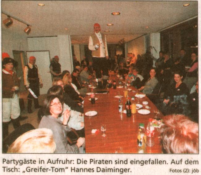 Sie reißt die Tür auf und mit großem Geschrei fallen acht Piraten über die beschauliche Runde her. Das Zeichen zum Angriff gibt Helene Daiminger. Die Schreiberin der Kabarettgruppe "Die Müllfischer" ist auch bei den Piraten für Text und Ablauf verantwortlich. "Wir orientieren uns immer an den Menschen, die gemeinsam feiern und bauen ihre Berufe oder Hobbys in unsere Texte ein." "Ihr seid in der Gewalt von Käpt'n Schwarzzahn, dem blutrünstigsten Piraten aller sieben Weltmeere." Die Gesellschaft reagiert erstaunt. Hier ein Tuscheln, da ein kleiner Witz. Doch die Piraten lassen nicht locker, zeigen, dass sie es ernst meinen und denken über Lösegeld nach. Der Aufschub kommt mit Greifer-Tom (Hannes Daiminger). |